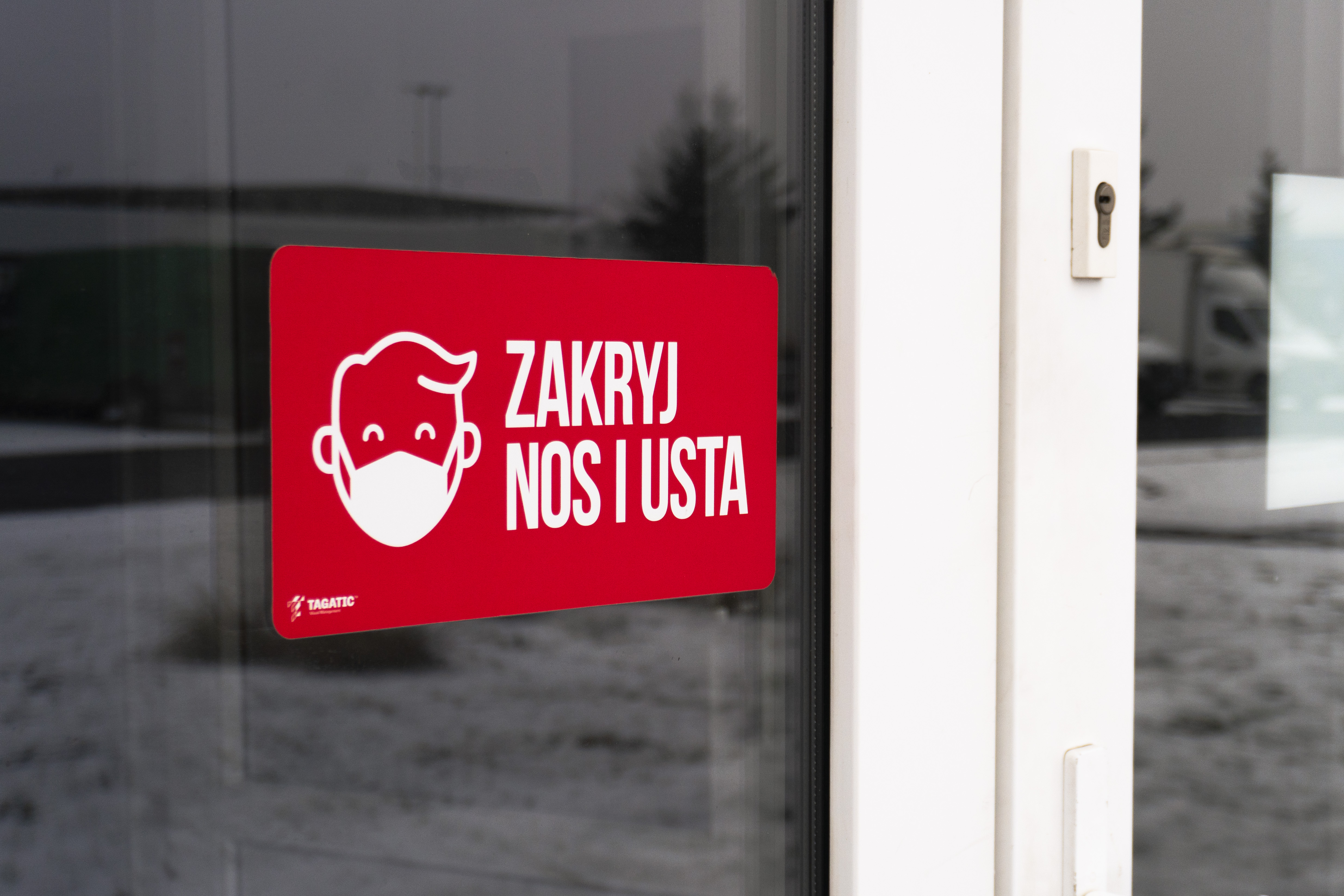 Naklejka informująca o obowiązku zakrywania nosa i ust. Wykonana z trwałej folii samoprzylepnej zadrukowanej w technologii UV. Odporna na warunki atmosferyczne i zmywanie. Wersja podłogowa pokryta laminatem antypoślizgowym klasy R9.